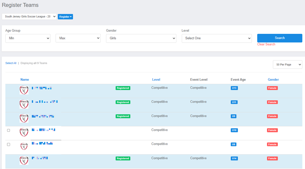 In the dropdown menu at the top, select South Jersey Girls Soccer League – 2024-25 US Club Soccer Registration/Passcards & Rosters then select the check boxes for the teams you’d like to register then select Register Teams already registered will show with a green Registered box